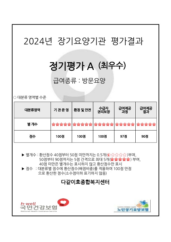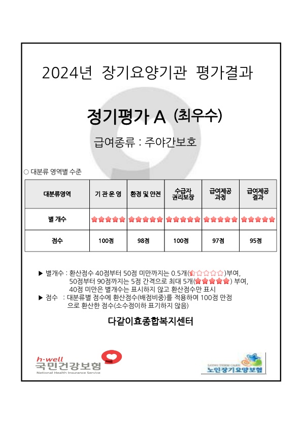 2024년 장기요양기관 정기평가결과 A(최우수)기간 선정