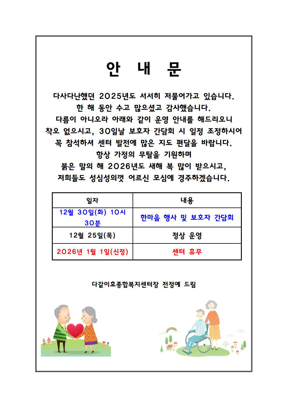 주간보호센터 신정 및 공휴일 휴원 안내